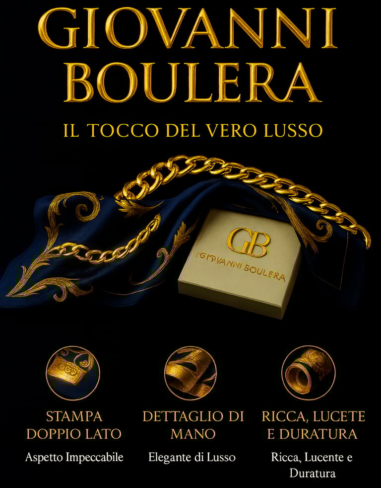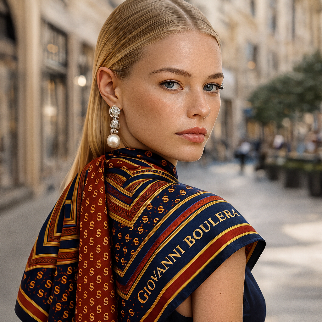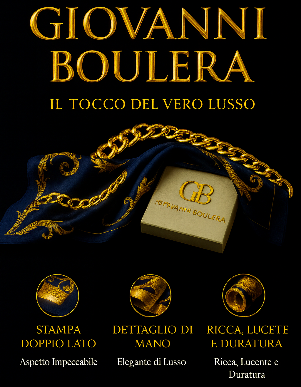 Artigianalità e Filosofia del DesignOgni foulard Giovanni Boulera è realizzato al 100% in seta di gelso, tessuta in fine twill — una tecnica tradizionale nota per la sua delicata trama diagonale e l’incredibile resistenza. I nostri artigiani garantiscono un allineamento perfetto dei motivi, orli rifiniti con precisione e una finitura impeccabile, per un accessorio dal vero livello couture.Ispirate all’eleganza europea e all’arte orientale, le collezioni Giovanni Boulera combinano accenti dorati, simmetrie geometriche e motivi senza tempo — ogni pezzo è una dichiarazione di lusso, sicurezza e individualità. Un Simbolo Senza Tempo di EleganzaIndossare un foulard in seta Giovanni Boulera significa molto più che esprimere uno stile.È un omaggio a secoli di artigianalità e alla bellezza naturale della seta.Che sia appoggiato sulle spalle, annodato tra i capelli o indossato come turbante, ogni foulard incarna la filosofia del brand:
