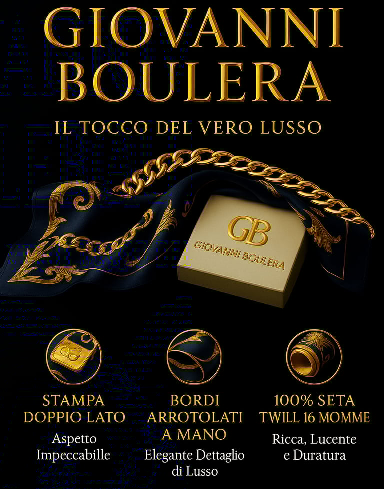 GIOVANNI BOULERA ; L’Arte della Seta — Collezione di Foulard in Seta 16 Momme di Giovanni Boulera,La seta affascina l’umanità da oltre cinquemila anni. Originaria delle antiche dinastie cinesi, questa preziosa fibra era un tempo riservata agli imperatori e alla nobiltà, simbolo di raffinatezza, bellezza e potere. Attraverso la leggendaria Via della Seta, il suo fascino si diffuse in ogni angolo del mondo — dai palazzi di Persia agli atelier d’Europa — diventando un’eterna icona di lusso ed eleganza. Da Giovanni Boulera, onoriamo questa straordinaria eredità reinterpretando la pura seta attraverso un’estetica moderna e un’eleganza ispirata all’arte italiana.Ogni Foulard in Seta 16 Momme Giovanni Boulera è una celebrazione di artigianalità, sofisticazione e della naturale brillantezza della seta stessa. L’Essenza della Seta 16 MommeIl termine momme (abbreviato mm) indica il peso e la densità della seta. Un momme equivale a 4,34 grammi per metro quadrato.La seta 16 momme è quindi sostanziosa ma raffinata — il perfetto equilibrio tra leggerezza e resistenza.Rispetto alle sete più leggere (8–12 mm), la seta twill 16 momme offre:✔ Durabilità Eccezionale Fibre più robuste che resistono agli strappi e mantengono la loro forma anche dopo anni di utilizzo.✔ Caduta EleganteUna consistenza naturalmente fluida ma strutturata, che cade con bellezza e armonia quando indossata.✔ Colore Intenso e Brillante La trama più densa esalta la saturazione dei colori, conferendo ai design Giovanni Boulera una finitura vibrante e luminosa.✔ Sensazione di Lusso Liscia e fresca sulla pelle, con una lucentezza naturale che riflette la luce in modo delicato.Questo peso ottimale rende la seta 16 momme ideale sia per foulard che per turbanti — sufficientemente robusta per valorizzare stampe complesse, ma abbastanza leggera per uno styling fluido e senza sforzo.